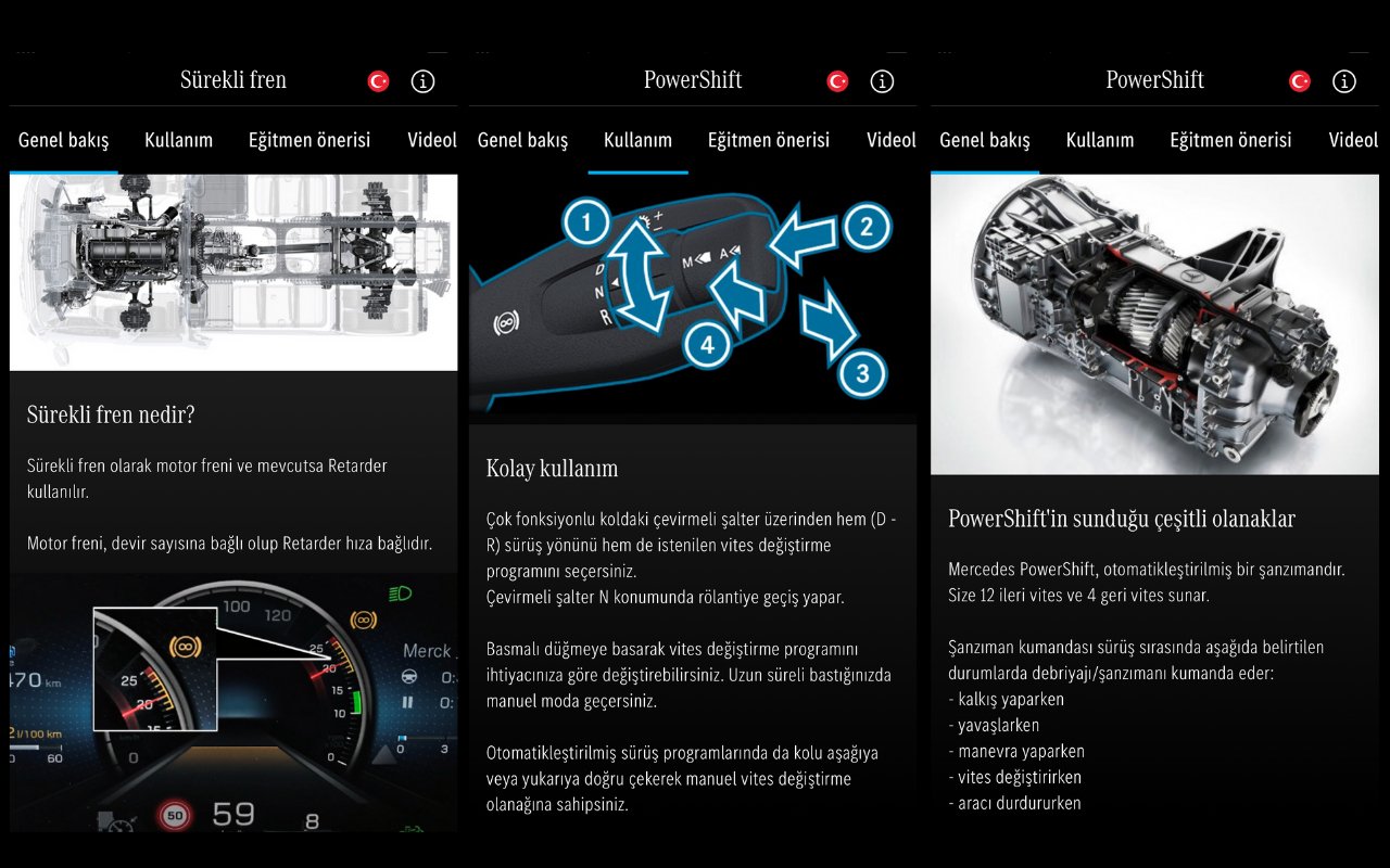 Satış öncesi ve sonrasında sunduğu hizmetlerle her zaman müşterilerinin yanında olan Mercedes-Benz, TruckTraining 2.0 uygulaması ile yeni nesil Actros kamyonlarıyla ilgili teknik bilgilere akıllı telefonlardan kolay bir şekilde ulaşılmasına olanak sağlıyor. Uygulama içerisindeki kısa içerikler, videolar ve eğitmen önerileri; sürücülerin günlük kullanımda ihtiyaç duyacakları özelliklerle ilgili soruların cevaplarına tek bir tuşla ulaşmalarına imkan tanıyor. Kullandıkları araçlarda sunulan teknolojileri doğru bir şekilde öğrenen sürücüler, böylece araçlarını daha güvenli ve ekonomik şekilde kullanabilecekler.