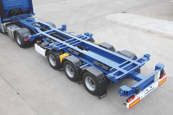 Oldukça basit ve son derece sağlam yapısının yanı sıra konteyner şasisi özellikle kolay kullanımı ve merkezi arka dışarı çıkarma, yüksekliği ayarlanabilir kilitler, standart dört adet kama ve geniş boyutlu lastik tamponlar gibi sayısız pratik donanım detayları ile dikkat çekmektedir. Başka bir artı noktası da, dorse king pinleri için iki pozisyonu ile yaygın kullanılan tüm çekici araçlar için uyarlanabilir olmasıdır.